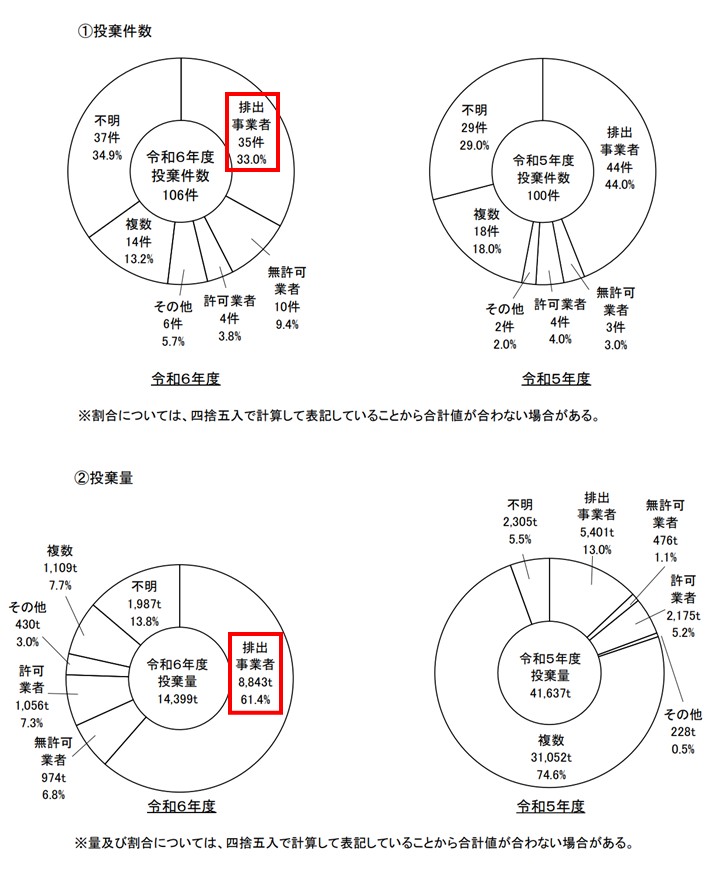 件数・投棄量ともに最多となったのは「排出事業者」であり、件数は35件(全体の33%)、投棄量は8,843トン(全体の61.4%)を占めています。